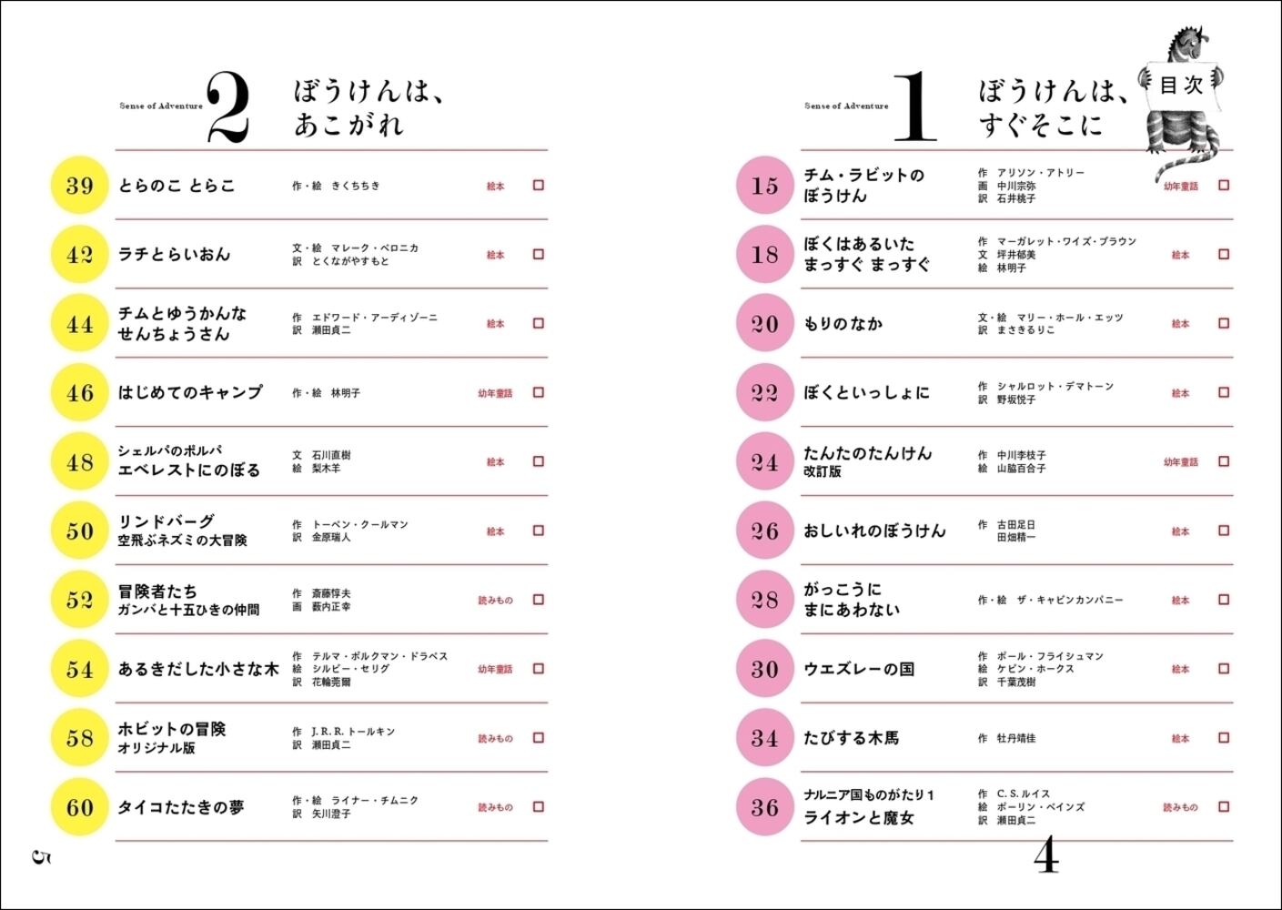 心躍る冒険、ちょっぴりせつない冒険、汗だくの冒険、じっと考える冒険、特別な冒険、日常を生きるという冒険。物語のなかで主人公たちは、その冒険が大きくても小さくても、うまくいってもいかなくても、それぞれのやり方で自分の世界を広げていきます。勇気をもらい、元気をもらえる「冒険」をキーワードに、絵本、童話、児童文学から一生ものの100冊を集めました。